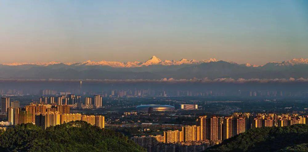 2021年6月4日清晨拍摄的成都市建筑群与远处的雪山(新华社发,嘉楠 摄)