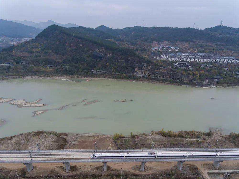 2017年12月6日,D4254次列车通过位于广元市北郊的西成高铁嘉陵江特大桥。列车行驶在嘉陵江西岸,东岸是始于北魏、兴于唐和五代的千佛崖摩崖石刻(新华社记者 江宏景 摄)