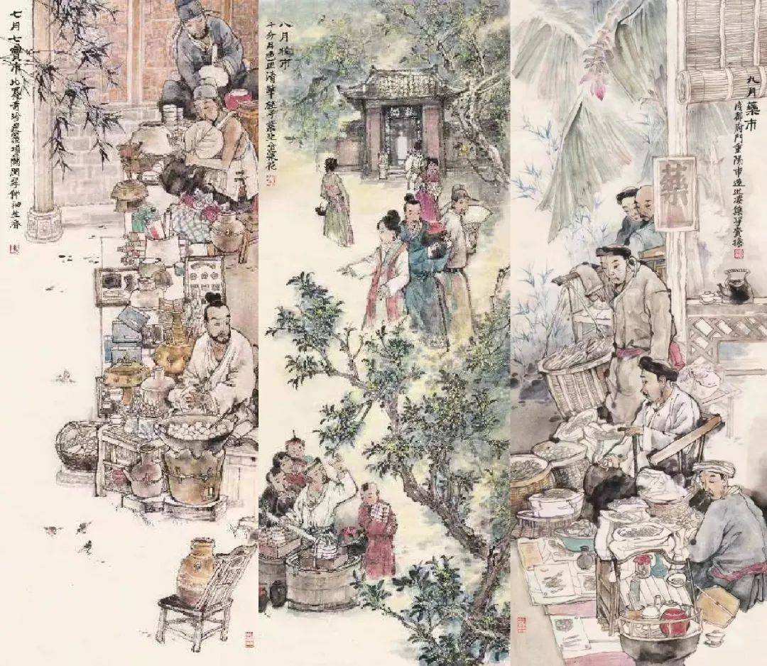 北宋 赵抃在《成都古今集记》中明确记载了“成都十二月市”:“正月灯市、二月花市、三月蚕市、四月锦市、五月扇市、六月香市、七月七宝市、八月桂市、九月药市、十月酒市、十一月梅市、十二月桃符市。”这些一年中每月定期销售四川土特产品的集会,不仅丰富了成都本地人的商业贸易和民间娱乐生活,更吸引着全国各地的商贾前来赶市贸易。这是千余年前农耕传统商业贸易老成都安逸的市井生活。