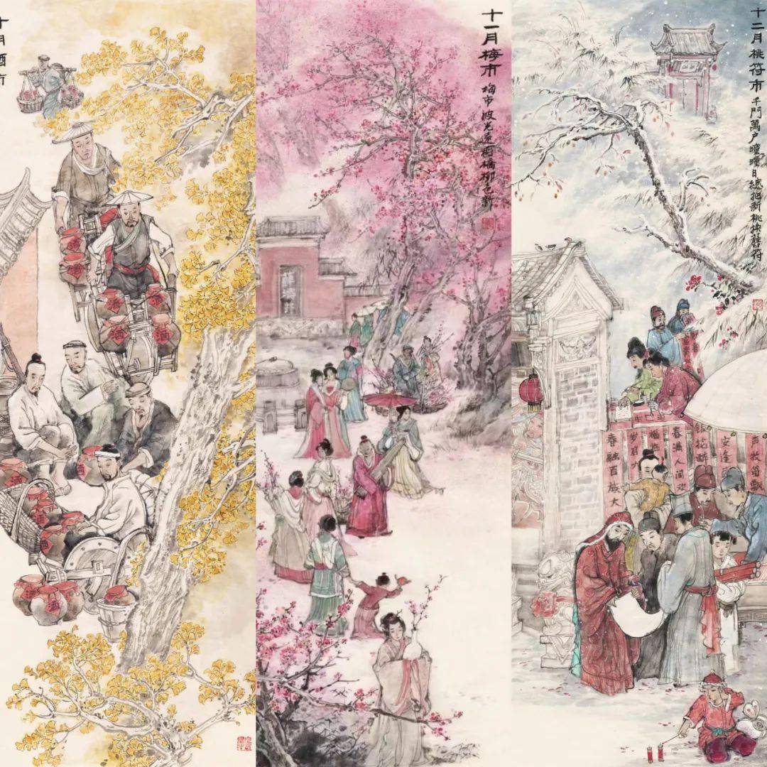 接到市委宣传部和市文联的创作任务后,我们三位画家就《成都十二月市》组画创作方向进行了深入探讨,重点表达成都自古到今,丰衣足食、商业昌盛、不知饥馑的繁荣场景。《成都十二月市》组画,使用了古代成都的场景设计和人物造型,特别注意加入我们成都地区特有的地域特点,尽最大可能表现出当年的市井味烟火味,让中外嘉宾可以通过画面穿越千年成都,聆听古城的声音,闻到美食的味道,看到山花的烂漫。