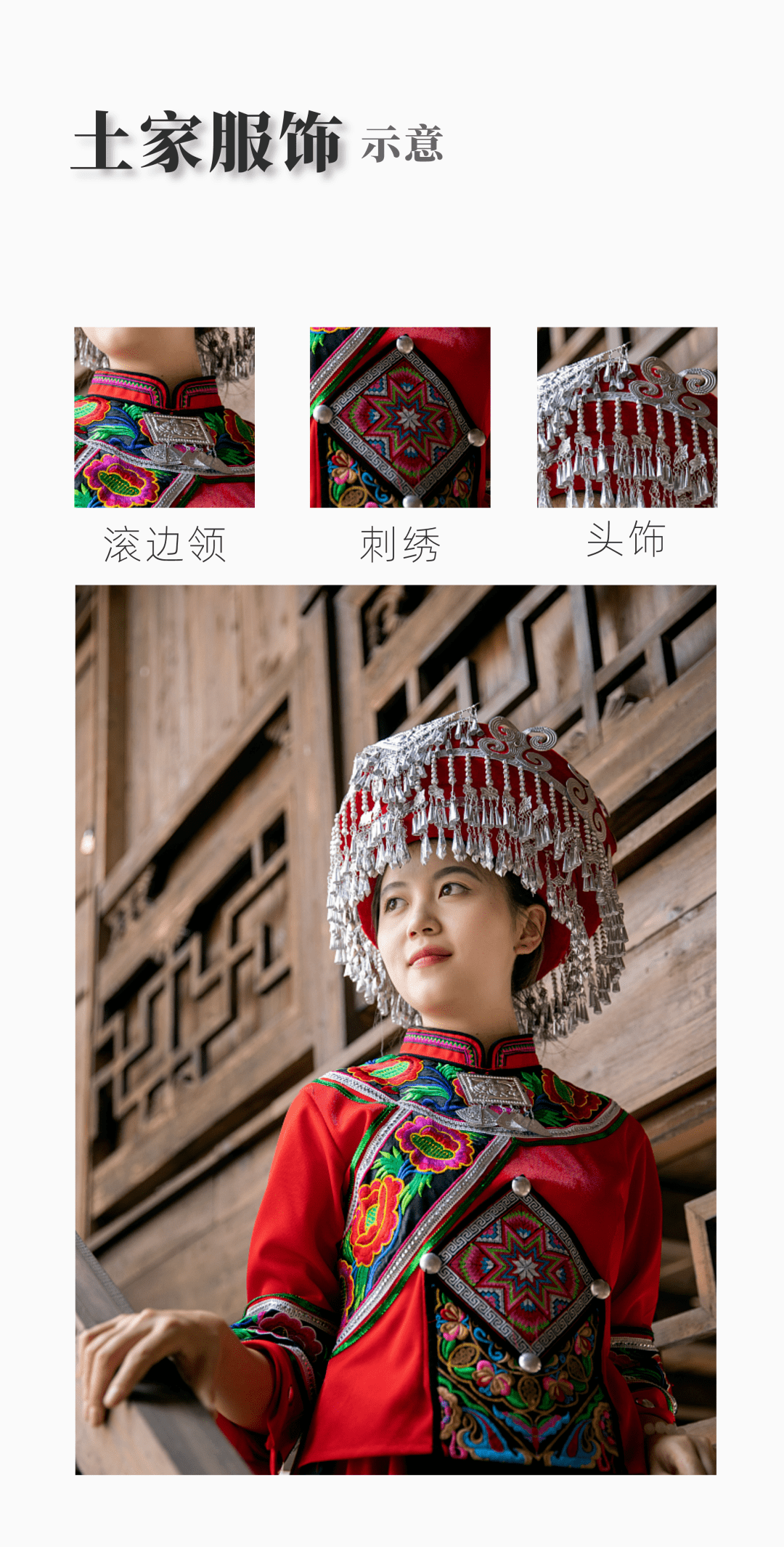 据宣汉县土家文化研究会会长张国述介绍,传统土家族服饰男子流行穿对襟,第二颗纽扣以上绣祥云,以下左襟绣青龙,右襟绣白虎,袖口绣兵书、宝剑和元宝。女人着 抄襟,胸前绣牡丹或杜鹃,袖口绣花卉、瓜果,腰拴花围裙。男女裤脚边都 绣着山川 河流图案。服饰绣花大意是,土家人脚踏山川河流,头伸云天之外,伫立于天地之间,在祖宗(青龙、白虎)护佑下,依靠勤劳的双手创造财富、捍卫家园。