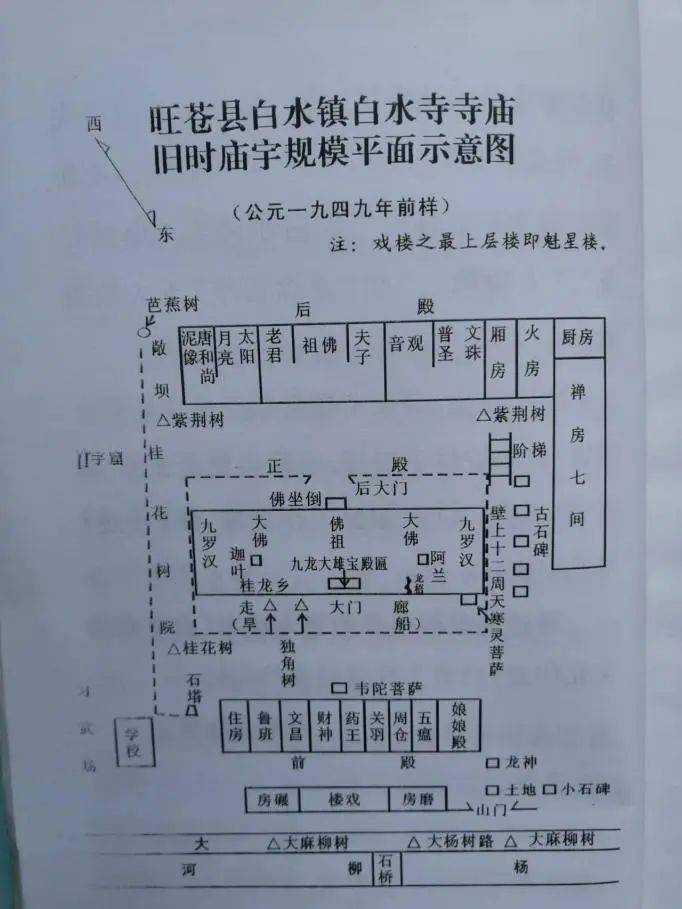 据相关资料记载,明、清时期,白水寺有庙产册林面积上千亩、田地上百亩。庙宇宏大,是一个典型的三进四合寺院,其中靠杨老河河岸是魁星楼,魁星楼后面有前殿、正殿和后殿;右侧是僧人住房、厨房、学校等;左侧是烧化纸钱的石塔钱库和废纸旧书焚烧的石塔;再左侧是约5亩面积的习武场;庙前杨柳绕河,庙后松柏参天。