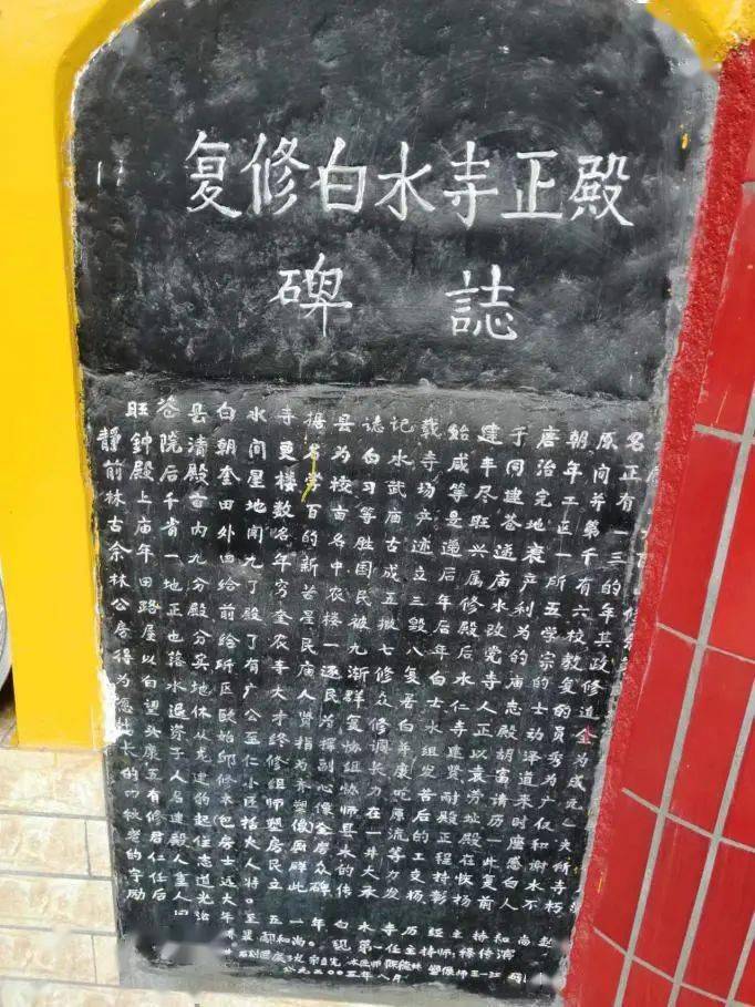 不可思议的是,现《培修白水寺碑志》石碑被一块2023年5月28日制作的《白水寺简介》牌完全覆盖,暂时无缘原碑文了。