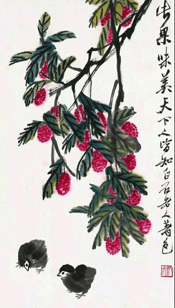 近现代画家齐白石也常画荔枝,曾云:“牡丹为花之王,荔枝为果之王,白菜为菜之王”,由此可以看出齐白石对荔枝的偏爱。齐白石还写有《荔枝诗》:“丹砂点上溪藤纸,香满筠篮清露滋。果类自当推第一,世间尤有昔人知。”齐白石晚年的荔枝画用色艳丽,笔力雄健,形成鲜明的个人风格。他绘有一幅《荔枝小鸡》。画面中,几枝成熟的荔枝从右上角倾斜而下,占据画面主体,两只毛茸茸的小鸡站立在荔枝果下,惦念着空中鲜艳可口的美食。画家用干笔重墨写出荔枝主干,用笔苍厚古朴,有篆书笔意。画树叶时,画家毛笔笔肚上水分较多,写出来的叶片含水量较大,水分和色彩融合氤氲,使得叶子生机勃勃、翠绿欲滴。鲜艳的荔枝果实掩映在树叶下,像一位位含羞的美人。两只小鸡身上的墨色变化丰富,淡墨在宣纸上洇开的痕迹恰似小鸡的绒毛。画家寥寥数笔勾勒出小鸡的身体结构,生动传神。