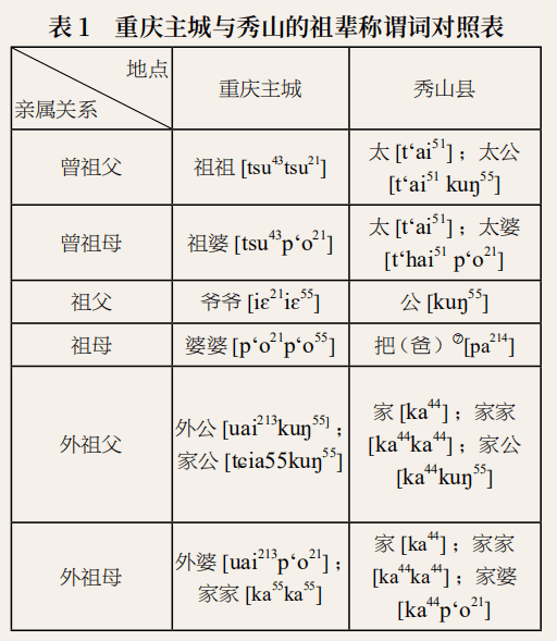 秀山土家族地区的亲属称谓属于苏丹式,正式的间接称谓与外地汉族无异,实践中在某些称谓上稍有差异。在实际的社交场合中,学会如何称呼其他亲友,是新成员尽快融入所属社区的有效途径,因而亲属称谓词便充当人与人之间交流沟通的桥梁。以下调查主要选取重庆主城和秀山的祖辈亲属称谓词进行对比。