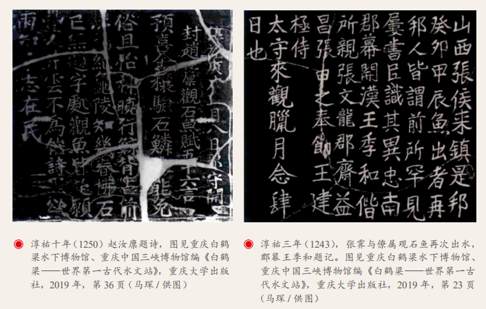 南宋淳祐年间刻石还有两例,一例为南宋淳祐八年(1248):“大宋淳祐戊申(八年,1248)正月,石鱼呈祥。郡守庐陵邓刚季中,率通判江阳何行可元达同观,望日谨志。”另一例为南宋淳祐十年(1250),知涪州赵汝廪到访,留下赋诗一首:“预喜今禳验石鳞,未能免俗且怡神。晓行鲸背占前梦,瑞纪龟陵知几春?拂石已无题字处,观鱼皆是愿丰人。片云不为催诗黑,欲雨知予志在民。”诗中流露出的赵汝廪对这一风俗的态度十分令人玩味,赵汝廪是四川朱子学传人,服膺理学,不免认为观“鱼”是沾染神鬼之说的落俗行为。但观“鱼”风俗寄托着美好的意愿,从“愿丰”“志在民”等字眼可知,赵汝廪觉得“怡神”的原因,在于该风俗与为民祈福有关,是士大夫心系百姓之举。这可能是战事百忙之中,四川官员仍然坚持参与这一风俗的原因。
