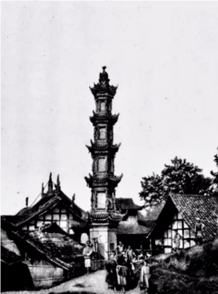 1908年,德国建筑师恩斯特·柏斯曼曾来到街子镇拍摄过朝阳村字库全景。这座六角五级攒尖楼阁式的字库塔,便成为百年前最早一批被西方眼光关注的四川建筑。只不过,这位德国建筑师把街子误记为“邛州的一个村庄”。