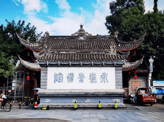 驱车从崇州市或都江堰市方向到街子古镇,迎面会看见一座三重飞檐牌楼,横额上书写着“西川第一天”5个大字。据查,这5个字出自清嘉庆年间光严寺僧万明《吟古寺》中的诗句:“古寺西川第一天,神今庙古万般全。水流风动花开谢,只计僧多不计年。”诗句里的“天”,指神圣共住之处,借以概括街子古镇优美的自然风光和丰厚的人文底蕴。