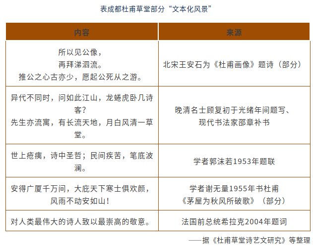 成都杜甫草堂,是唐代诗人杜甫流寓成都时的故居,他曾在此创作了240余首诗歌。唐末诗人韦庄寻得草堂遗址,重结茅屋,宋元明清历代修葺扩建,使之成为中国保存最完好、最具特色的杜甫行踪遗迹地。据不完全统计,杜甫草堂现有馆藏珍贵文献3万余册(含十数种语言的外译本和朝鲜、日本出版的刻本120余部);各类文物2000余件,包括古今与杜甫及杜诗有关的碑刻、书画、对联、印章等,它们共同构成杜甫草堂“文本化的风景”。