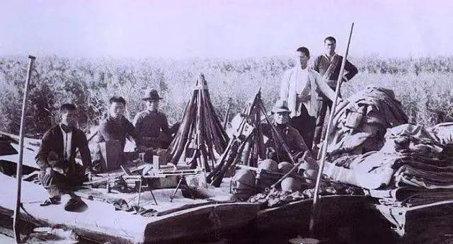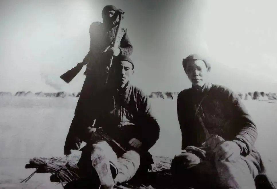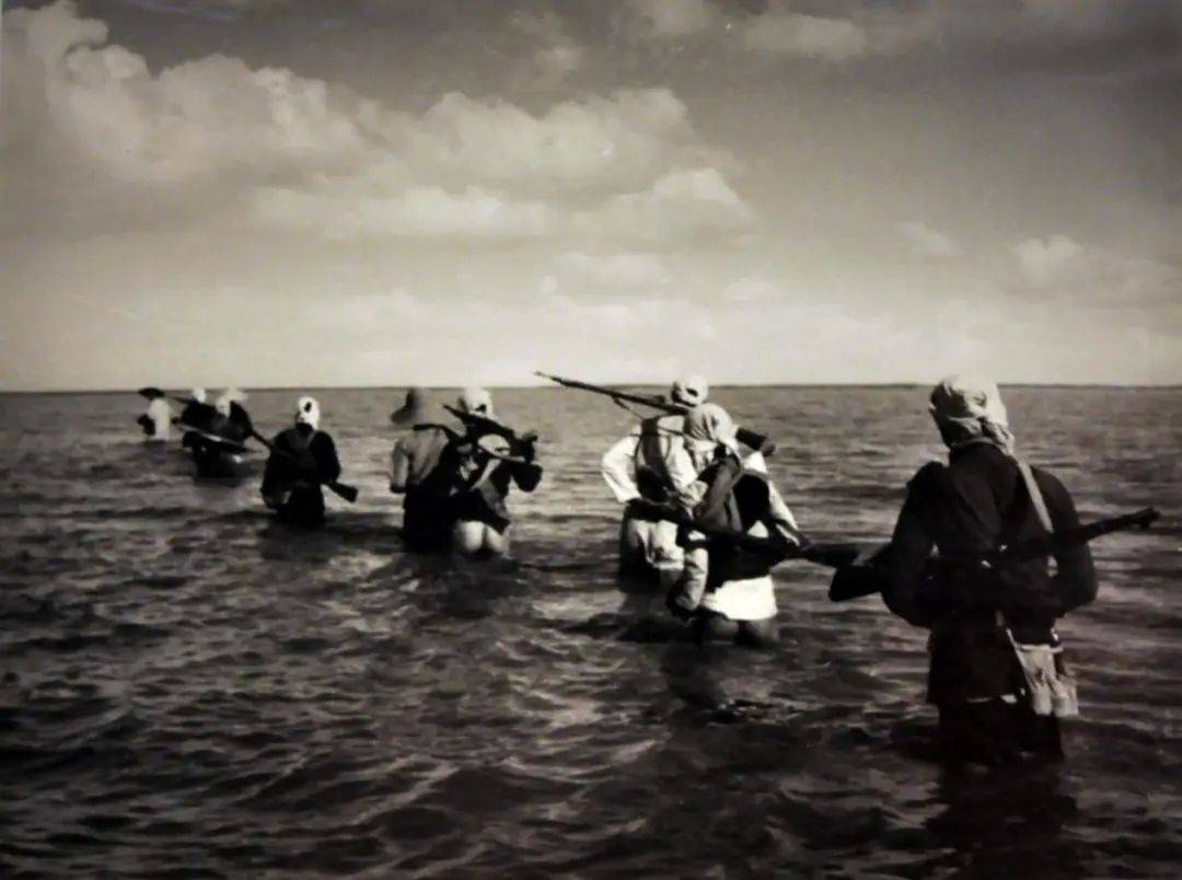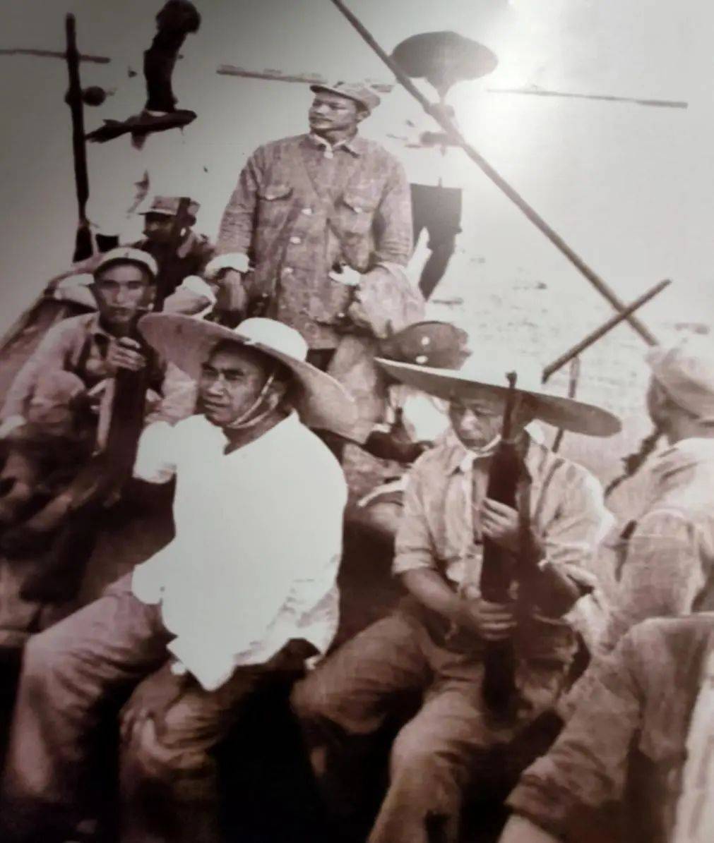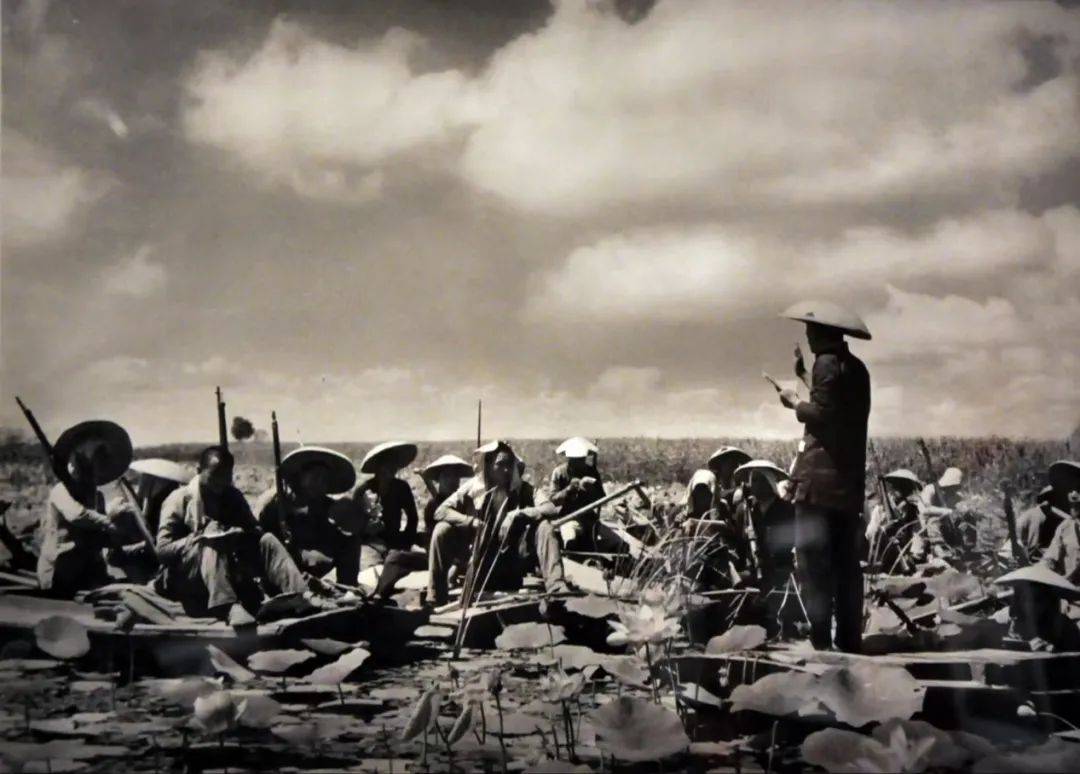 1947年清风店战役前夕,朱总司令(前左一)在聂荣臻司令员(前左二,与朱总一样手持钢枪)陪同下视察白洋淀,高度评价雁翎队