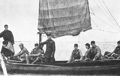 “现在你知道他们到了哪里?”“管他哩,也许跑到天边上去了!”她们都抬起头往远处看了看。“哎呀!那边过来一只船。”“哎呀!日本,你看那衣裳!”“快摇!”小船拼命往前摇。她们心里也许有些后悔,不该这么冒冒失失走来;也许有些怨恨那些走远了的人。但是立刻就想,什么也别想了,快摇,大船紧紧追过来。大船追得很紧。