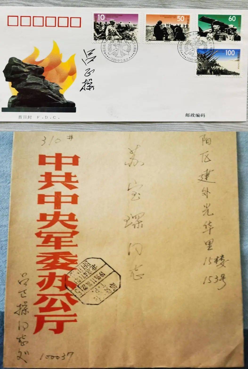 1995年9月3日,邮政发行纪念“抗战胜利暨世界反法西斯战争胜利五十周年”首日封,吕正操将军签名留念。下图为中共中央军委办公厅发出的实寄封(落款为将军手书的“吕正操同志处”。邮章日期1995年11月24日)(苏宝琛 刘鸿雁 供图)