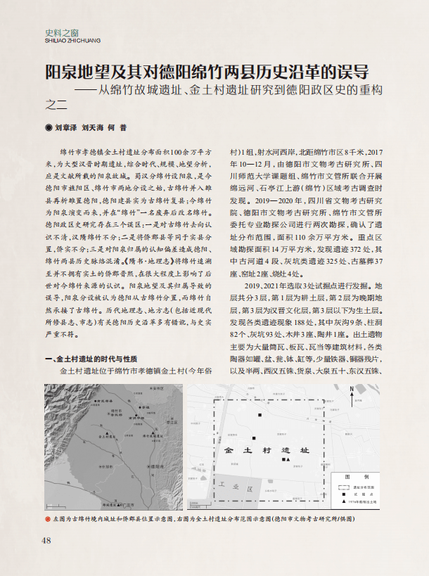 绵竹市孝德镇金土村遗址分布面积100余万平方米,为大型汉晋时期遗址,综合时代、规模、地望分析,应是文献所载的阳泉故城。蜀汉分绵竹设阳泉,是今德阳市旌阳区、绵竹市两地分设之始,古绵竹并入雒县再析雒置德阳,德阳建县实为古绵竹复县;今绵竹为阳泉演变而来,并在“绵竹”一名废弃后改名绵竹。德阳政区史研究存在三个误区:一是对古绵竹去向认识不清,汉隋绵竹不分;二是将侨郡县等同于实县分置,侨实不分;三是对阳泉归属的认知偏差造成德阳、绵竹两县历史脉络混淆。《隋书·地理志》将绵竹追溯至并不拥有实土的侨郡晋熙,在很大程度上影响了后世对今绵竹来源的认识。阳泉地望及其归属导致的误导,阳泉分设被认为德阳从古绵竹分置,而绵竹自然承接了古绵竹。历代地理志、地方志(包括近现代所修县志、市志)有关德阳历史沿革多有错讹,与史实严重不符。