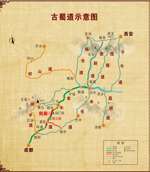 1.金牛道:勉县→宁强→广元→昭化→剑门→绵阳→成都(金牛道还有条岔路,折往阆中→南充→重庆)