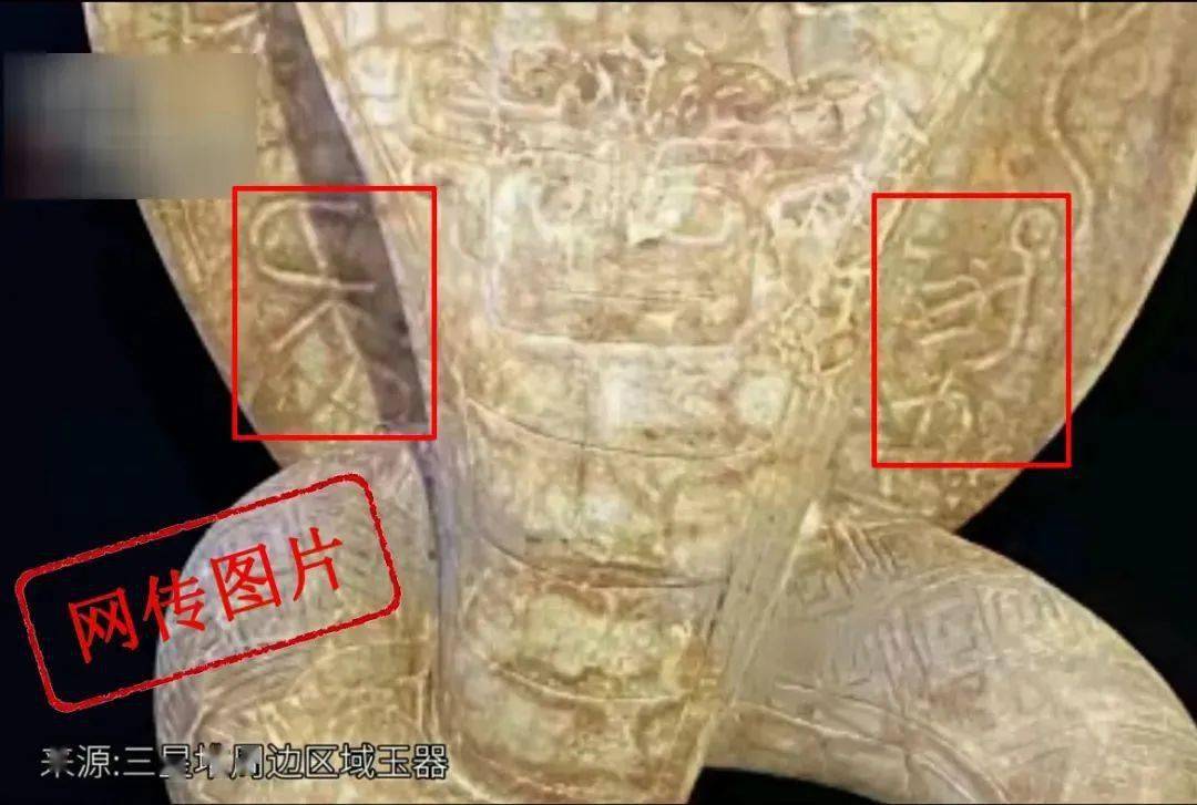 网传三星堆文物的文字和纹饰。哦,不对,人家说的是“三星堆周边区域玉器”,有心“回避”了敏感信息。堆堆辟谣,我们可从来没有这样的东西。