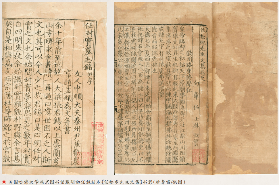 其实,此本并非元刻本,其据有三,一是卷10结束后有摹印“任勉私印”“任氏近思”,乃任勉印章,而任勉为明初人,从其生平来看,不可能在元世刻此书;二是该本刻字属闽刻风格,应非刻于元顺帝至正四年(1344)浙江行中书省;三是书名作“元松乡先生文集”,如刻于元代,书名中不会用“元”字。相应地,哈佛藏本将书名中“元”字挖改为“任”,本意即想冒充元刻。