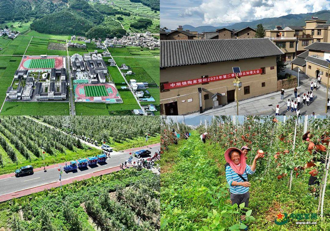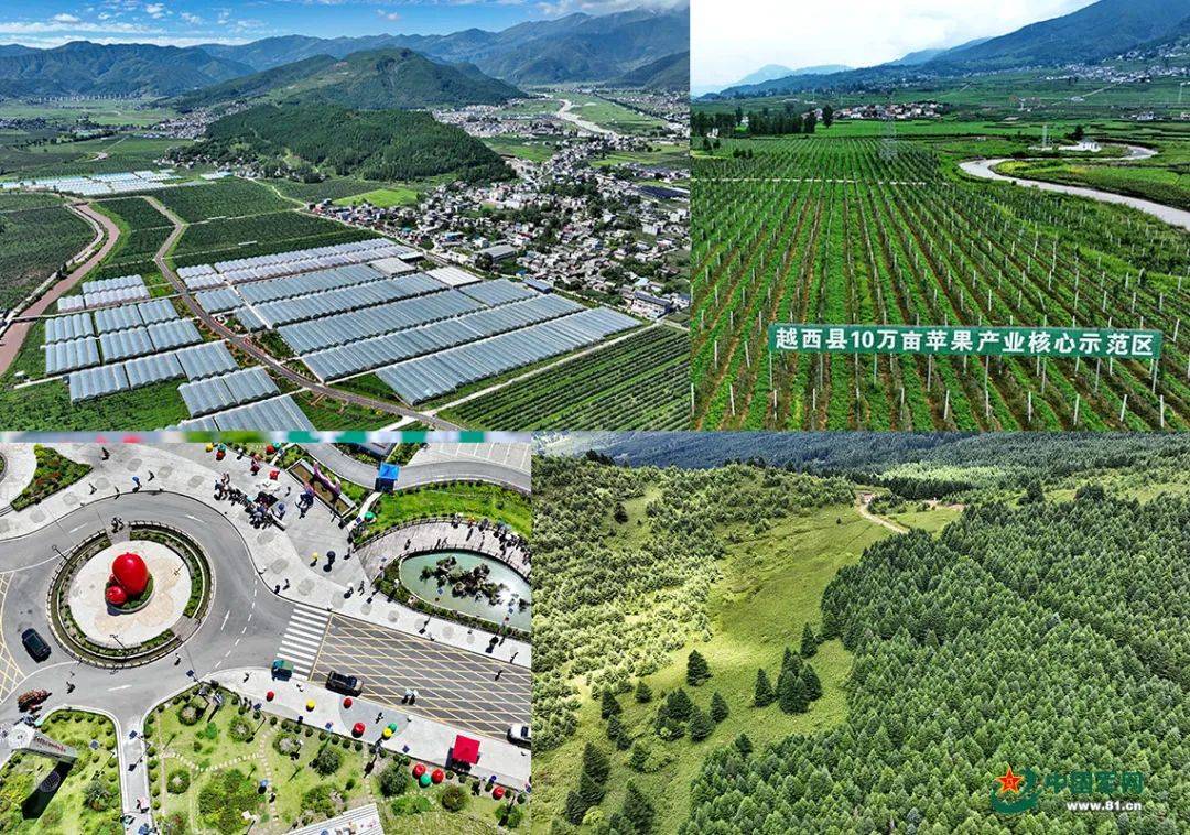 拼版照片:(左上)越西县对口新援建的中、小学学校新貌(无人机照片);(左下)越西县乡村旅游促进当地经济驶入快车道(无人机照片);(右上)越西县中所镇陶家营十八碉彝族民居(无人机照片);(右下)当地百姓在越西县苹果科技产业园采摘苹果(柳军 摄)