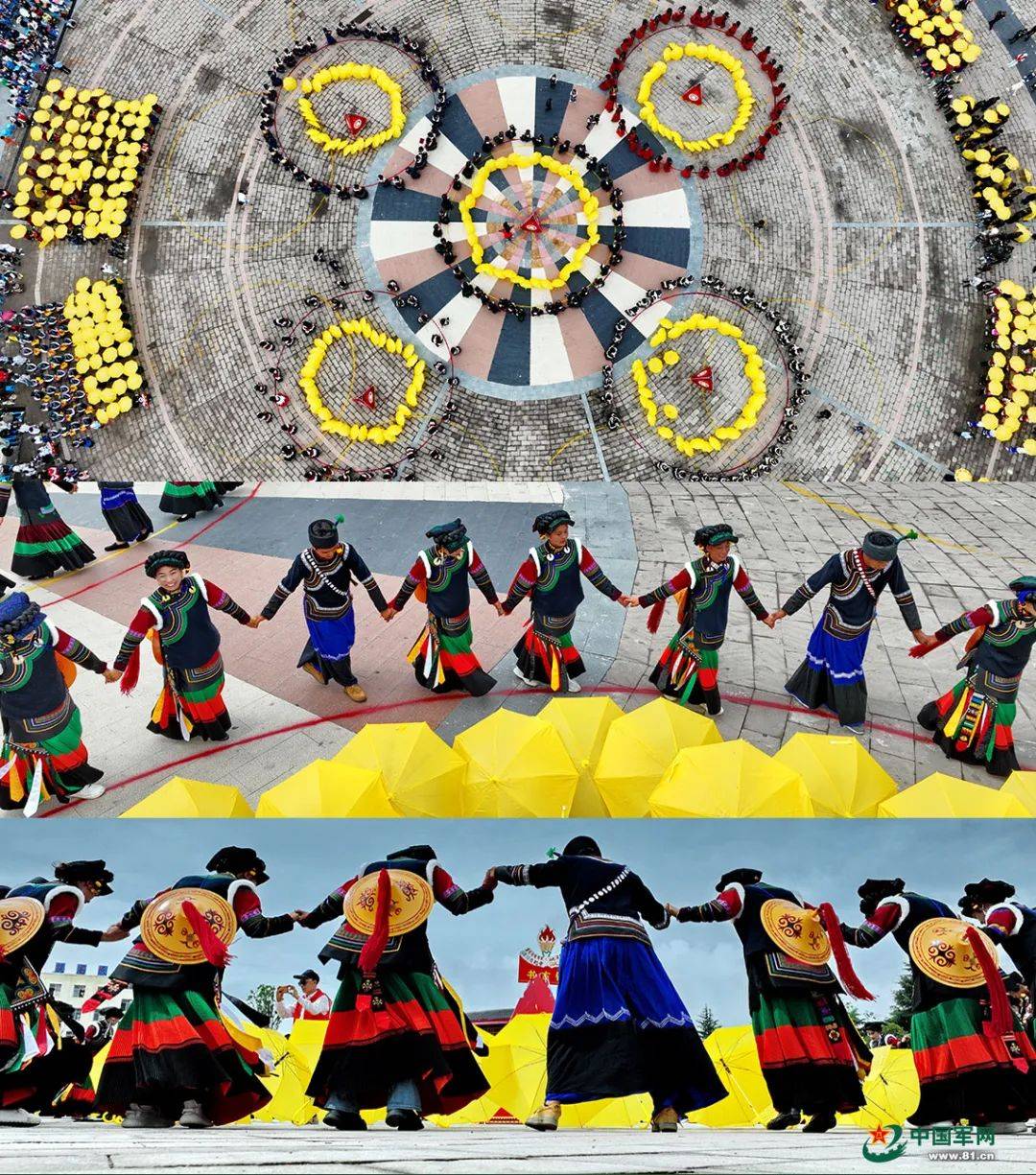 拼版照片:在四川越西县普雄火把节上,当地百姓跳起彝族达体舞(柳军、薛舜尧 摄)