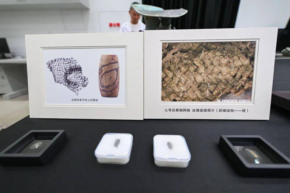 2023年7月26日在三星堆博物馆拍摄的丝绸显微照片和提取实物(新华社记者 王曦 摄)