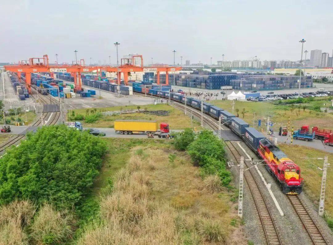 4月26日,“法国邮政DPD号”国际班列从成都国际铁路港驶出(图片来源:新华社记者 王曦/摄)
