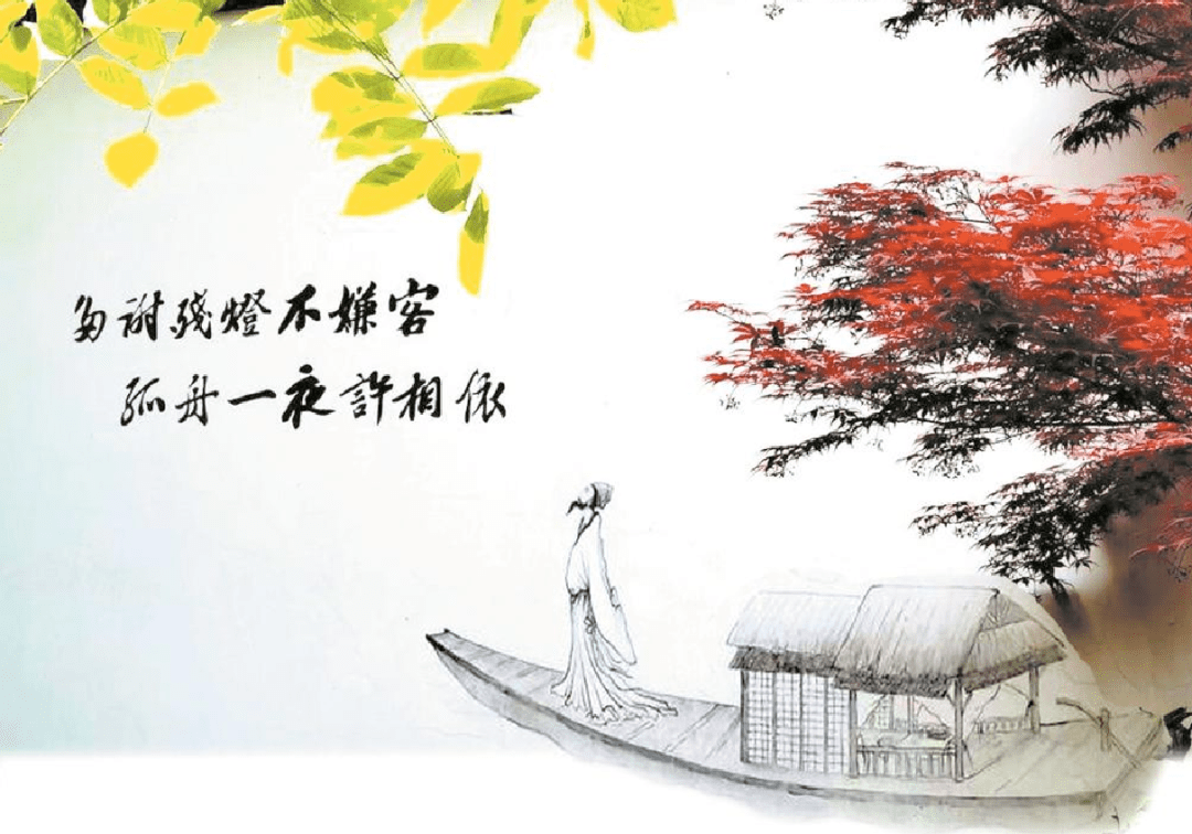 从月洞门进入归里园,深浅两色的小灰砖墁地,拼成菱形。靠南侧那堵围墙,素白墙面,青瓦庇檐。墙尽头有几株苗条的槭树,善解人意地朝中央倾斜,色彩鲜丽但范围适度,构成恰到好处的点染。红叶下方是笔触疏淡的一条篷船,四周波浪清浅。船首有位宽袖长袍的文士,背手站立,若有所思。墙面写着“多谢残灯不嫌客,孤舟一夜许相依。”这是苏轼《除夜野宿常州城外二首》(之一)的尾联。