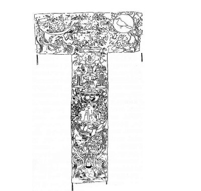 需要指出的是,这一进程和墓主人辛追灵魂升仙的进程是同步的。马王堆汉墓T形帛画的构图和汉代画像石天界、人间、地下世界的三段模式非常近似,所以很多学者据此将T形帛画也划分为天界、人间、地下三部分。但这种看法我不赞成。我比较赞同T形帛画的主题是引魂升天的主张。日本京都大学教授曾部川宽对汉代灵魂升仙的主题有非常深入的研究。1981年他出版的《向昆仑山升仙——古代中国人描绘的死后世界》(《崑崙山への昇仙——古代中国人が描いた死後の世界》)中,指出这幅非衣的主题就是升仙主题。整幅T形帛画描述的是墓主人辛追升仙的进程。从下到上,T形帛画中央整个中轴贯穿着的是一个升腾的主题。阴阳两条龙自下而上在中央部分穿璧而过,托举起魂车。魂车上的核心人物通常认为就是墓主人辛追。按照这一解释,中间部分描绘的并不是我们生活的人间,而是从地下向天界升腾的墓主人辛追不断升向仙界的魂魄。画面上她的魂魄正被二龙牵引的魂车引向天门。从时间上说,辛追的魂魄将要进入的,同样是由死亡而再生的进程。