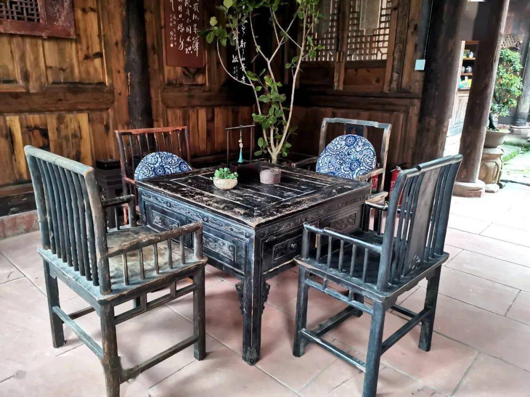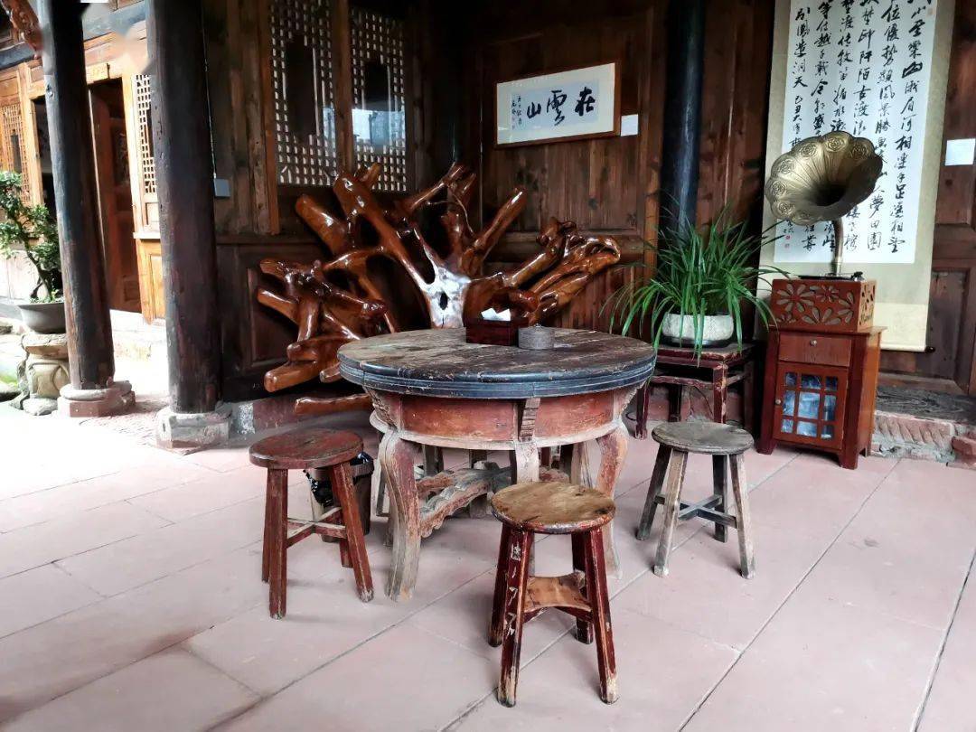 前厅摆放着一方一圆的两套木桌,其黑褐色的颜色彰显着老物件的悠久,这一方一圆的设置是否蕴含着天方地圆的哲学理念,以及阴阳平衡的统一呢?前厅左侧耳房摆放着一张老式雕花木床,不知是谁享用过这种奢华;右侧耳房设置成一间书屋,名曰沫若书屋。天井中央摆放着一口红砂石方形大水缸,水缸上的人物雕塑栩栩如生,旁边置一担水桶。别处的荷塘早已枯萎,而此处水缸里的荷叶亭亭玉立,水中红色的小鱼游来游去,自由而欢快,似乎秋天不曾来过这里。屋檐拐角处摆放着各种盆景,姿态优美,几座乌木雕件也显得灵气大方。