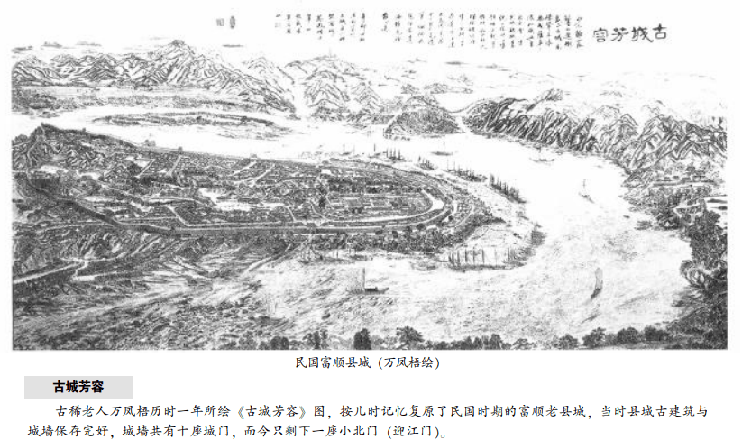 抗战时期,沿海沦陷,川盐再次济楚,但富荣盐场分属富顺、荣县的弊端却阻碍了盐业的发展。为适应战时军需、民食及支援抗战,民国二十八年(1939)八月经四川省政府批准,划出县境西北的桐垱镇(自井镇)、长丘镇、上丘镇(筱溪)、新垱镇(大坟堡)、新又乡(凉高山乡)、大山乡、高硐乡等主要产盐区设立自贡市。没有了以盐为主的产业支撑,富顺又重新回到农业经济的时代,成为全省名副其实的农业大县。民国后期,全县概查面积为2127.14平方公里。