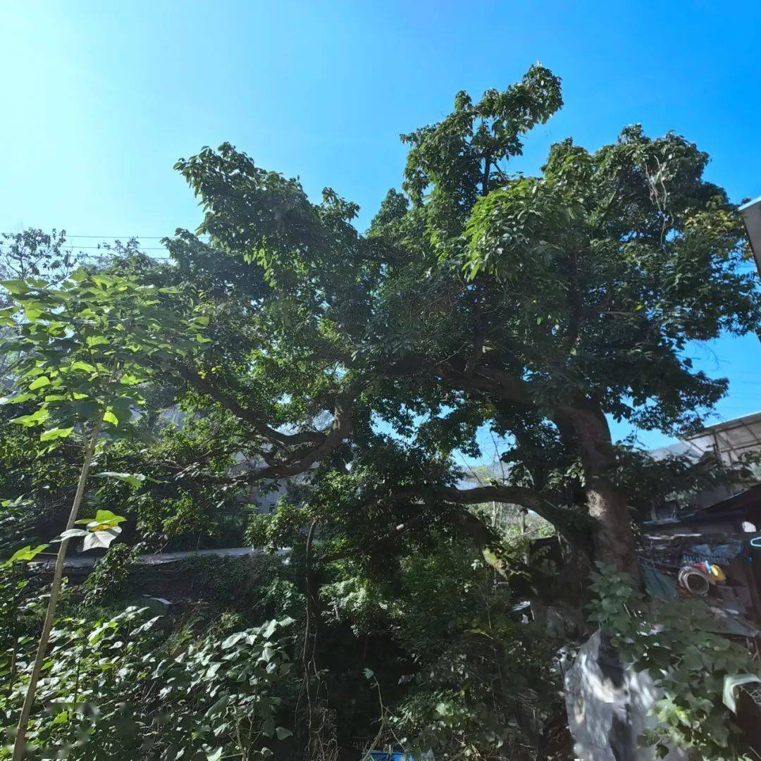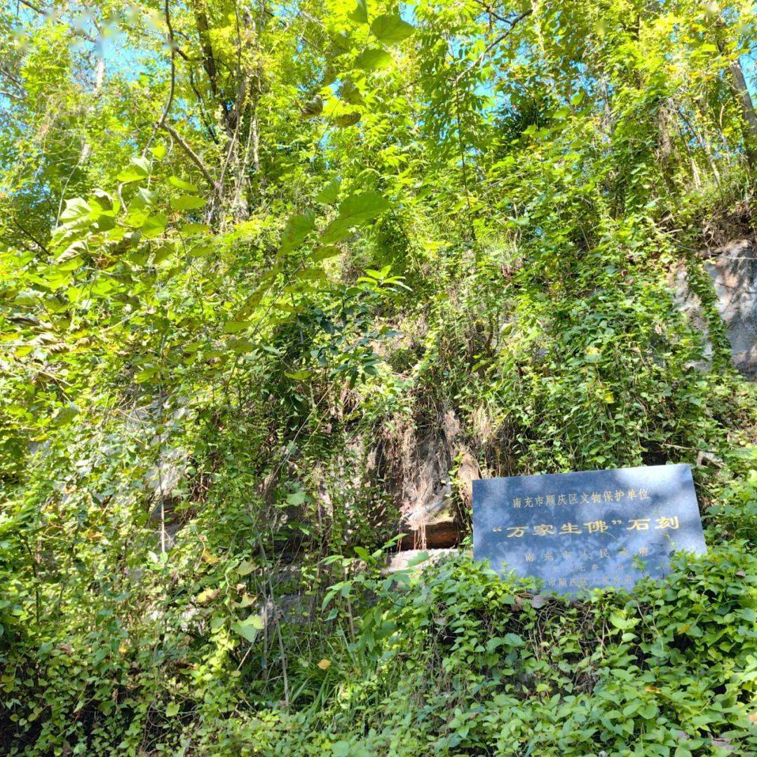 蹬行长长的石条山路,随处抬头可见山路右手侧崖壁上镌刻的汉唐明清石刻文字,依稀可辨的石刻文字如“德洽果州”“忠义之邦”,比较清晰的有“万家生佛”(楷书)、“鸟道”(行草)等。原古道旁水涧中有巨石耸立高约数丈,人称“会仙石”,今已不见,唯见水涧两边崖壁上杂树森森。一处临近水涧边斜倾生长着一株老黄葛树,树枝弯曲如虬,树叶茂密,阳光穿过树枝间隙,洒下数道金色光柱。