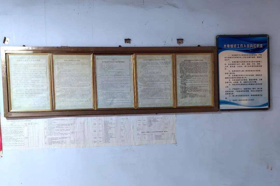 建于20世纪50年代,青砖青瓦砖混结构。共有房屋7间,分别作电器仪表监测房、办公室、工具房、库房、抽水泵房等。小院中间院坝原有一砖砌水泥结构水塔。2008年“5·12”汶川特大地震后,该水塔基本无变化。据多人回忆,2013年因担心垮塌伤人,学校将此塔撤除。值得一提的是,配电四合小院旁至今保留着当年建造的一座地下水窖(水电班师傅都习惯叫“水缸”)。地下水缸直径10米、深3.5米,有顶盖遮蔽灰尘,盖面竖立通气铸铁管,留有两个水窖井口,平时井盖关闭。水缸旁建有净水循环槽。整个工艺流程:打开水阀从市上二水厂进水→引入净水槽→流入地缸→由抽水泵抽水→水塔→加压送水→生活洗漱用水。当年建造的净水供水设施,除水塔已撤除外,其他建筑设施基本保存完好。据水电班负责人戴师傅介绍,水电班历任员工都注意保护好水电班的仪器设备,好些仪表仍可使用,比如学校总水表一直运行正常,水窖泵房也完好。水缸循环水槽也畅通。他建议把水缸等设施整理一下,可作为学校开展供给水教育的工作教育坊。