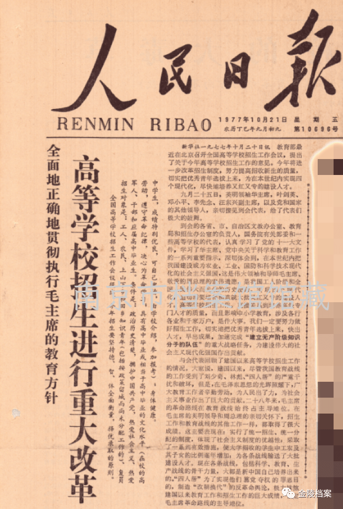 同年10月12日,国务院批转教育部《关于1977年高等学校招生工作的意见》,正式恢复高等学校招生统一考试制度。10月21 日,《人民日报》在头版头条发表《高等学校招生进行重大改革》,向全社会宣布恢复高考这个好消息。