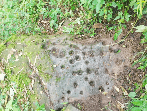 上山没走多远,路旁便出现残墙断垣,路上有了拐子窝。越往山上走,拐子窝越来越密,也越来越大,扒开苔藓、泥土,仔细数了数,最多的一块石头上,大大小小有36个拐子窝,最大的足有拳头大。