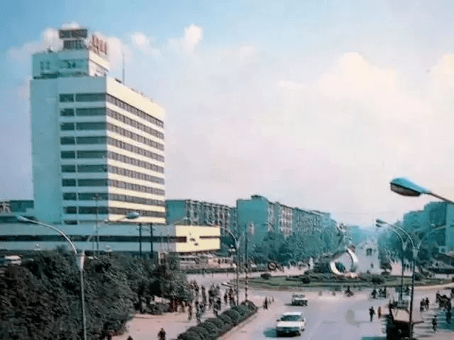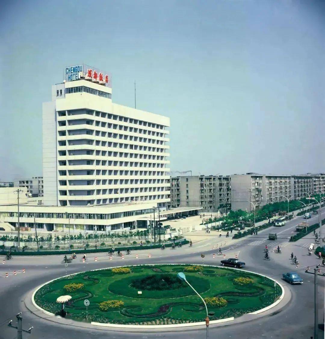 1985年,“成都建设者”雕像在成都饭店路口中央处的街心花园落成。外地人来了一定会来这里,站在雕塑前以成都饭店为背景拍张照。本地人新人结婚也会来这里照张相。“从雕像那个圆环为前景拍成都饭店,还是特别好看的。”师学林回忆说。