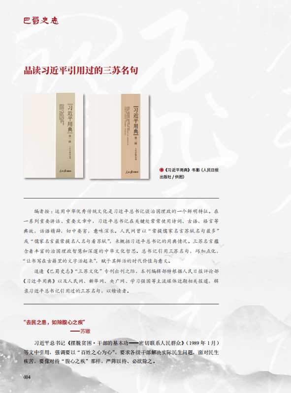 适逢《巴蜀史志》“三苏文化”专刊出刊之际,《巴蜀史志》编辑部特根据人民日报评论部《习近平用典》以及人民网、新华网、央广网、学习强国等主流媒体近期相关报道,辑录习近平总书记引用过的三苏名句,以飨读者。