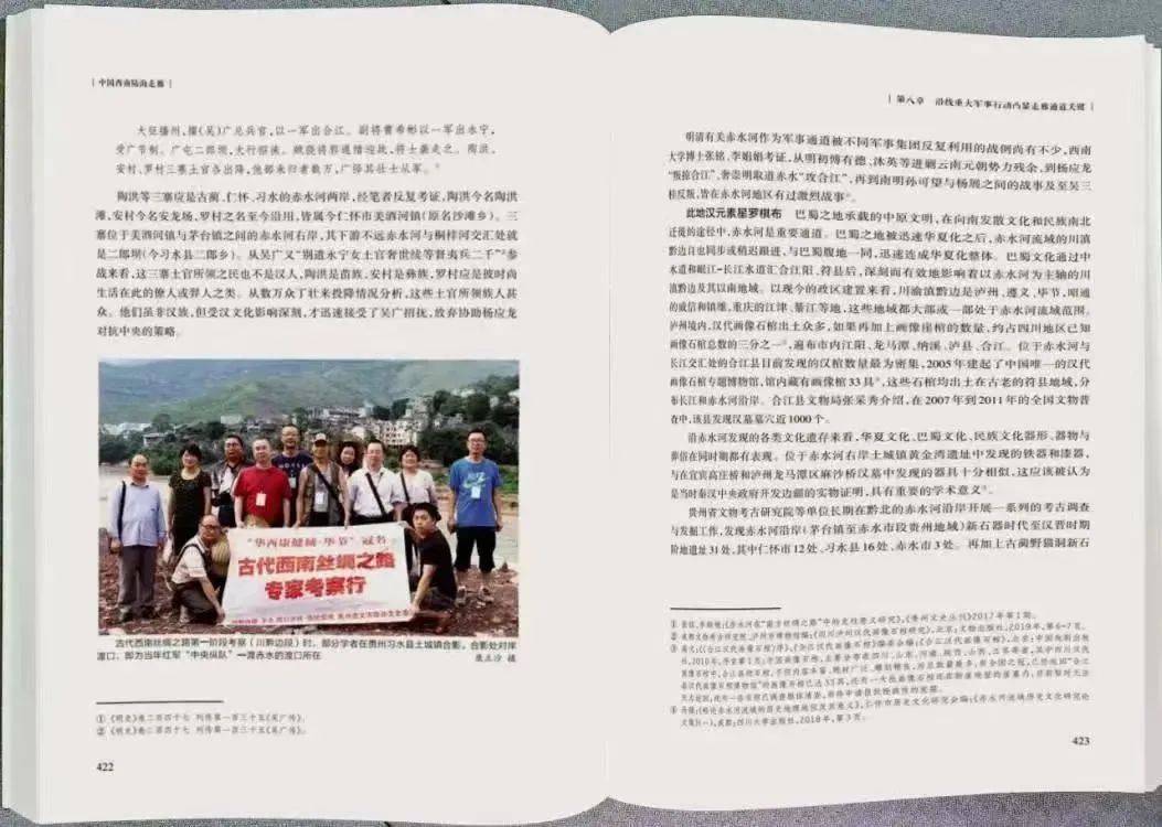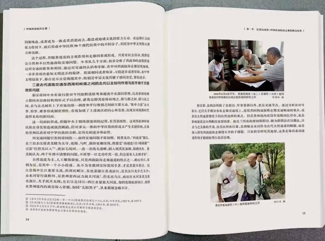 要想做到前述多种研究方法的结合和大量研究工作的开展,只靠一个人的力量是难以实现的,必须借助集体的力量。因此,从研究过程看,《中国西南陆海走廊》实质上是一个庞大学术共同体的合作成果。以赵晓东先生及其所在单位为纽带,将高校科研院所的职业学者、政府官员、民间乡土学者、新闻传媒从业者等连在一起,组成一个研究“中国西南陆海走廊” 的学术共同体。不同学者有不同专长,参与不同工作,相互合作交流,他们参与的过程和内容都在书中得到呈现。来自高校科研院所的职业学者主要分两大群体:一是为本项研究提供学术指导和支持的学者,包括李学勤、蔡美彪、胡昭曦、陈世松、 谭继和、向宝云、段渝、郭声波、刘复生、蒋廷瑜、张合荣等先生;二是直接参与研究考察工作的学者,包括彭邦本、蓝勇、晋保平、宫长为、王兴骥、彭华等先生。他们大多来自考古学、历史地理学、巴蜀历史文化研究等领域,在制定主攻方向、破解重点问题、对话理论前沿等方面都发挥了重要作用。对地方历史文化素有研究的部分地方政府官员和大量民间乡土学者通过参与考察、座谈或访谈等方式,提出很多富有见地的观点或难以捕捉的信息,为本项研究做了重大贡献。以赵晓东先生原担任总编辑的《酒城新报》及其他媒体为主阵地,将考察活动和相关研究成果第一时间向外界发布,引发了百姓对该项研究的兴趣和关注,使得学术研究成果走向社会、走进民间。因此,不论在研究工作的效率和成就上,还是在研究成果的价值和影响力上,都体现出这样一种学术共同体的力量。围绕《中国西南陆海走廊》所形成的学术共同体及其合作模式,可为很多大型研究工作的开展提供借鉴。
