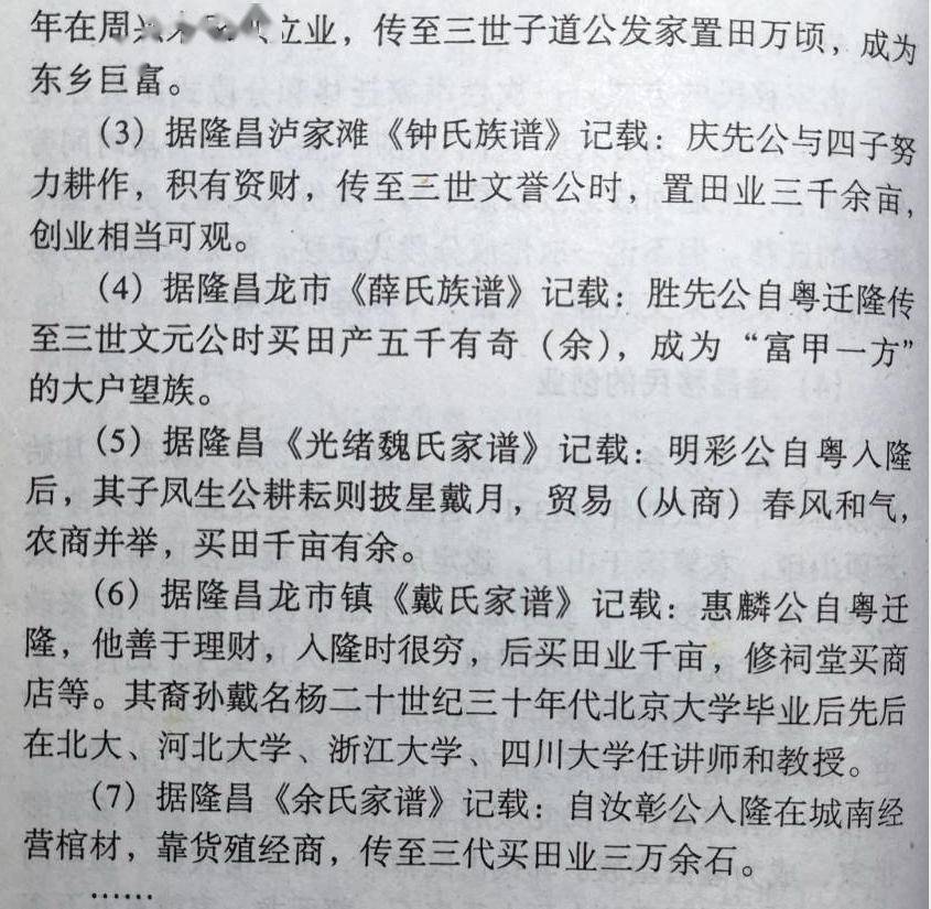 上述祖源地距隆昌5000多里,连年天灾生活艰难,知道四川人少地多,皇帝发诏书迁川,一个村几个数十个乃至上百个拖老携幼迁川人出发了。风餐露宿,所带钱粮也很快用尽,各地迁隆人员不得已卖衣卖儿救急,亲人途中病亡,只好烧炭挑来隆昌。白手起家垦荒创业更是艰苦异常。乾隆二十九年县志未载插占,记始而佃耕未几即为业户。一些家庭渡过难关,买田土商铺修住房祠堂,续修族谱。有的几代后仍难,只好迁走或并入近缘支,一些早期有载现已无。