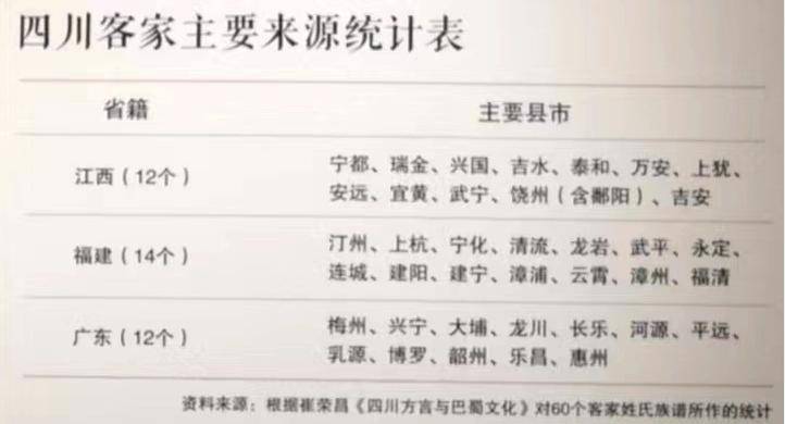 四川客家主要来源统计表