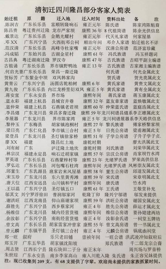 隆昌部分客家人简表,包括始迁祖、原籍、迁入地、迁入时间、资料出处,备注收集字辈、祠堂等信息。曾经每个家族有祠堂,有的几个近血缘同姓家族共用,现基本不存。现多数仍用字辈。字辈不同的肯定是不同家族,字辈相同的也有不同家族,如孔颜曾氏由皇帝赐字辈;有的并入近缘支后字辈相同,但统一或单独修谱仍然保持原有谱系。209支是目前县级聚居区之最多,展示隆昌客家历史文化的特殊贡献!丰富了四川客家史料。姓名前加与未加小点.的,是曾一书与余广琪调查收集信息。部分家族系主动提供。