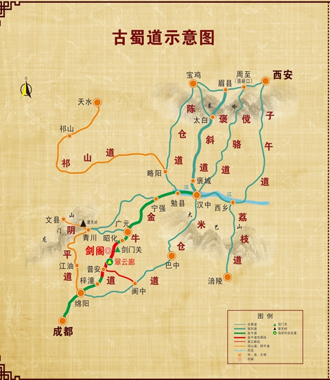 1.金牛道:勉县→宁强→广元→昭化→剑门→绵阳→成都(金牛道还有条岔路,折往阆中→南充→重庆)