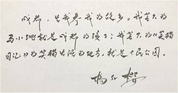 杨红樱老师题词:成都,生我养我的故乡,我笔下的马小跳就是成都的孩子……