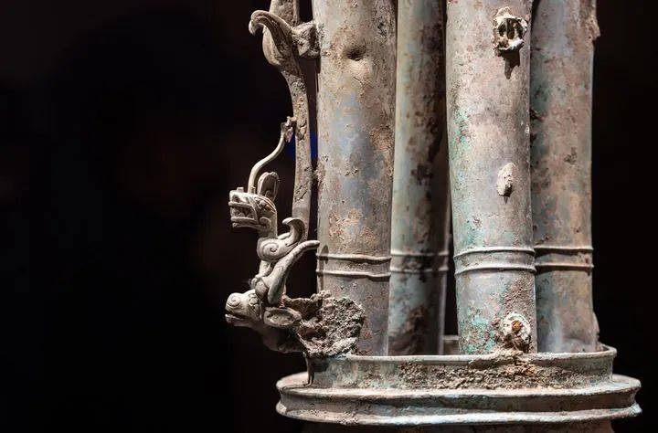 就在这件神树的一侧,一条头上长角、昂首挺胸的“神龙”,睁着铜铃般大小的圆眼,缘树逶迤而下,前足踏于神树的山形底座上,麻花状的躯干向后翻起附于神树的主干上,躯干上伸出像人手掌一样纤细修长的后足,整条龙造型飘逸灵动又奇异诡谲,莫可名状。
