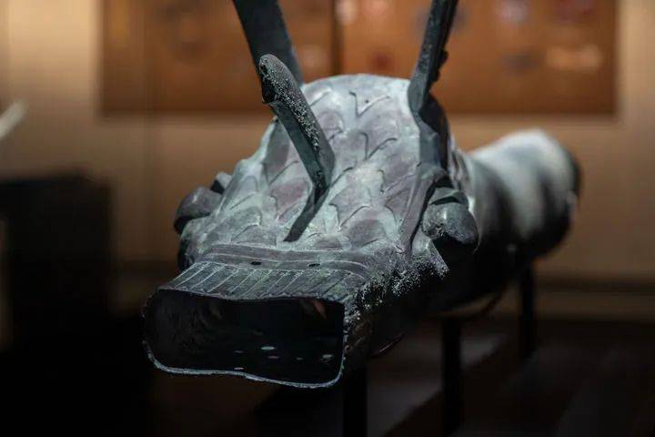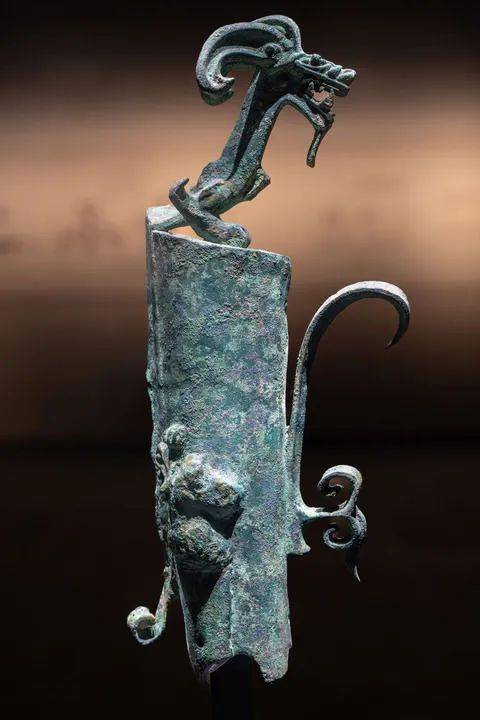 据专家推测,这件青铜龙柱形器下面原本应该连接着木质的杖身,只是出土的时候杖身已经不存了,就剩了杖头,这也是一件龙形权杖的一部分。