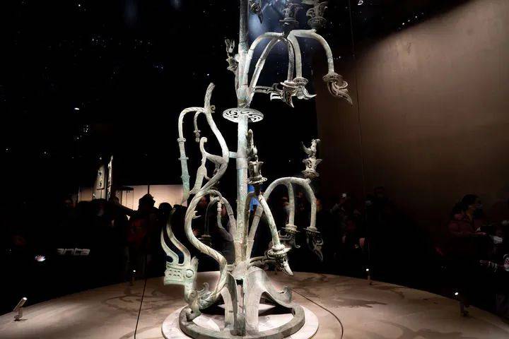 青铜神树陈列于三星堆博物馆新馆最末一个展厅中央。在特意布置的星空穹顶之下,通高3.96米的青铜神树卓然挺拔,有直接天宇之势。树分三层,每层三簇枝丫;每枝上有一仰一垂两枚果枝,朝上的果枝上立有神鸟。在记录中国古代神话的《山海经》里,有屹立于东方和西方的“扶桑”“若木”神树。三星堆的巨大青铜神树,把古代中国“宇宙神树”展现出来,成了远古神话最直观的“实物样本”,诠释了千载传唱的关于“神树”“十日”和“太阳鸟”的美丽传说。