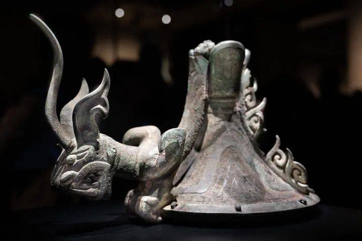 三星堆青铜龙柱形器,一头长有羊角和山羊胡须的龙踞于柱首。