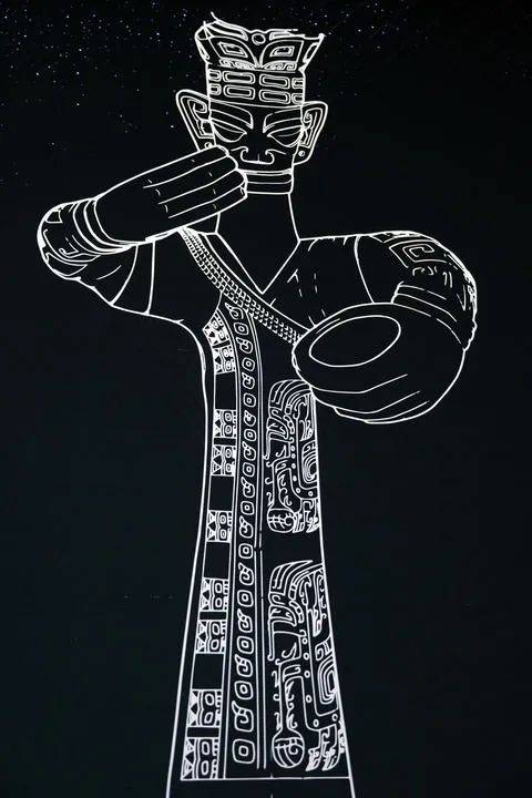 中国丝绸博物馆副馆长周旸认为,三星堆的“青铜大立人”,服饰繁纹满饰,纹样工整,应是描摹一位身着“衮衣绣裳”的领袖主持隆重祭典的场景。而“他”外裳上的“团龙”纹样,与后世皇帝祭天时穿着的衮服一脉相承,是“龙袍”的雏形,反映了古代先民高超的丝绸织造技术和审美。