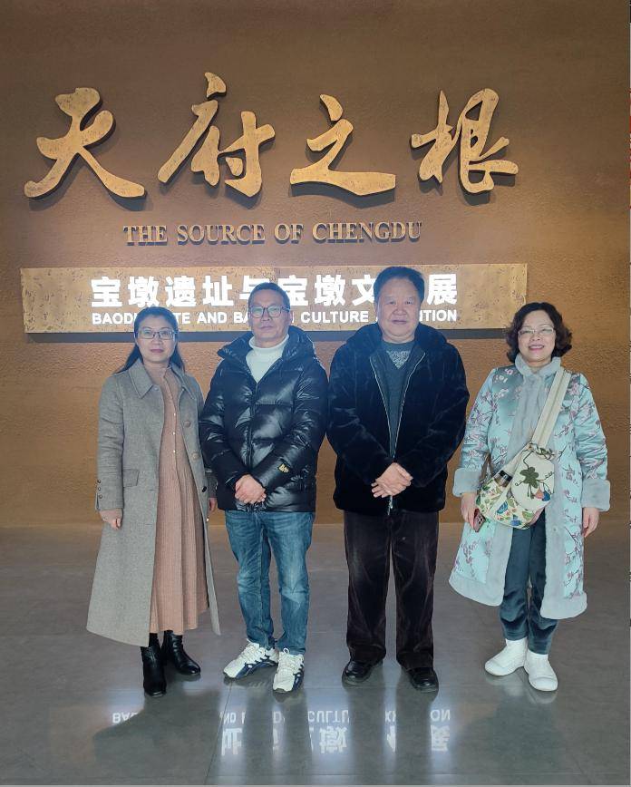 新津宝墩遗址,应是蜀人先祖居住的地方!也因此,今天的各级党政部门十分重视。记得2023年3月9日,笔者与几位朋友驱车专程至新津参观宝墩遗址,当我们来到宝墩博物馆便见不少人在参观。我们在“天府寻根”图下留影时巧遇刚从市委宣传部副部长调任市文联任党组书记的杨晓阳,他与施江、叶浪等几位市委宣传部原领导也来宝墩参观调研,也来寻根。杨晓阳同志是笔者昔日在成都市广播电视局工作的同事,这位不到50岁的年轻同事,如今又担重任,一上马就来宝墩调研,关注着新津这蜀地重要的历史文化遗址。这天,我们一起在新津蜀地寻根,在宝墩遗址展厅的巨图“天府寻根”下合影,一起探源蜀人祖先,蜀地地方历史文化。
