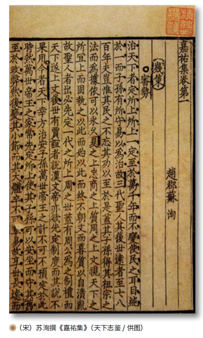 在《嘉祐集》中,既有相互联贯的成组论文,如《权书》《衡论》均多达10篇;又有洋洋洒洒,长达四五千言的大块文章,如《上皇帝书》。曾巩说,苏洵之文,“少或百字,多或千言,其指事析理,引物托喻,侈能尽之约,远能见之近,大能使之微,小能使之著,烦能不乱,肆能不流。其雄壮俊伟,若决江河而下也;其辉光明白,若引星辰而上也”(《苏明允哀词》)。这可算是对苏洵散文的定评。