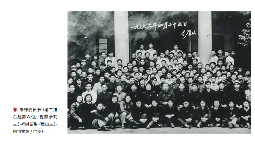 1963年4月25日,75岁高龄的共和国开国元勋、全国人大常委会委员长朱德莅临眉山三苏祠视察参观,留下题词:“一家三父子,都是大文豪。诗赋传千古,峨眉共比高。”当时,朱德委员长发现自己曾经收藏和阅读过的《三苏全集》居然在这里现身,非常激动。据《名人与三苏祠》记载,原来,这是他早年驻军泸州时得到的一套清代眉山刻本《三苏全集》,每册第一页都盖有他的藏书印信“德字玉阶”“仪陇朱氏藏书”。这套书后来几经辗转,到了泸州私塾先生阴懋德仑手中。1961年初,阴懋德仑老人将这套珍贵的《三苏全集》,捐献给了刚刚成立的眉山三苏纪念馆。如今,朱德题词、“朱德墨兰”、曾被朱德早年收藏过的《三苏全集》,被誉为三苏祠博物馆馆藏的“朱德三宝”。