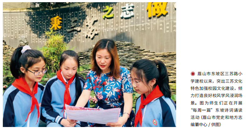 大众化方向,做细宣传普及。近年来,眉山大力推进东坡文化进校园,精心编写《品读东坡》《苏门家风》等优秀校本课程读本,《传承发展东坡文化,营造灵动诗意校园》入选教育部全国中小学德育工作典型经验。注重沉浸体验,联合35个省市级研学实践教育基地,推出宋代投壶、活字印刷、传拓等课程,举办东坡传说故事大赛、三苏诗词经典诵读等活动,掀起“争当小东坡”热潮。培养传承力量,组建东坡文化讲师团,培养东坡文化讲师100多名,建设东坡文化传习基地18个、传承特色学校12所。加强宣传普及,在《眉山日报》开设三苏文化专栏“开眼界”,打造“东坡书院”“悦读坊”等新型城市文化空间,定期邀请名家登台主讲“东坡文化大讲堂”“三苏文化沙龙”等,广泛开展“艺行东坡”等群众文化活动,举办东坡诗词专场音乐会、“吾家东坡——苏轼题材文物特展”等,推动东坡文化走出书斋、走进百姓,在潜移默化中扩大东坡文化传承的群众基础。