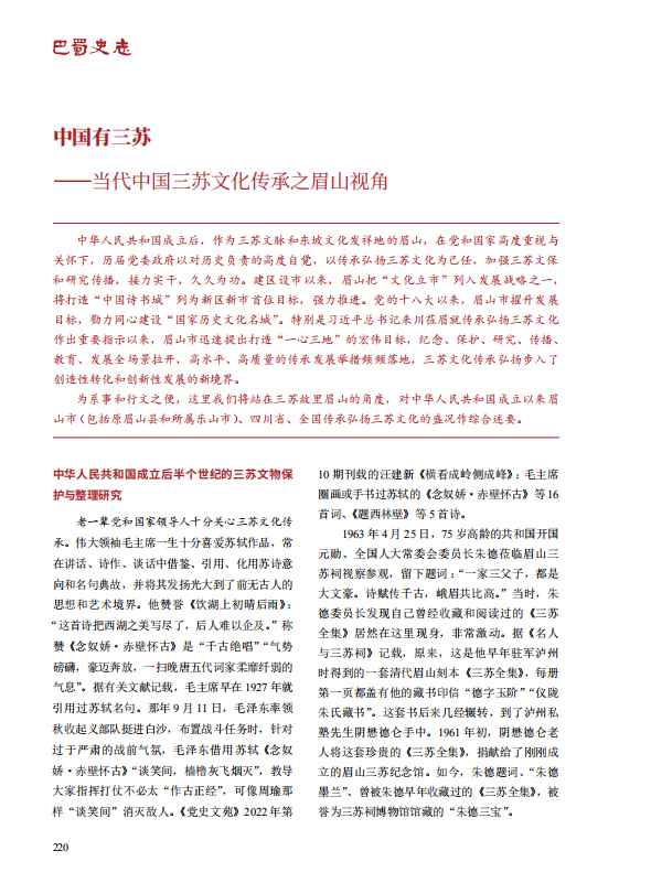 为系事和行文之便,这里我们将站在三苏故里眉山的角度,对中华人民共和国成立以来眉山市(包括原眉山县和所属乐山市)、四川省、全国传承弘扬三苏文化的盛况作综合述要。